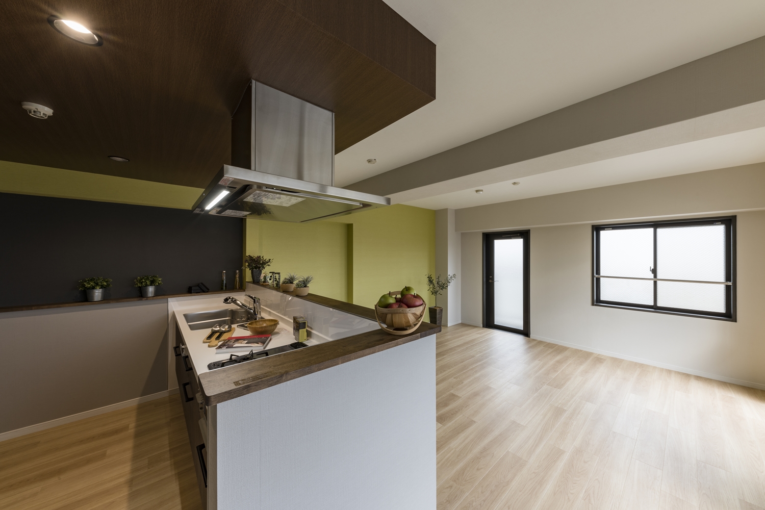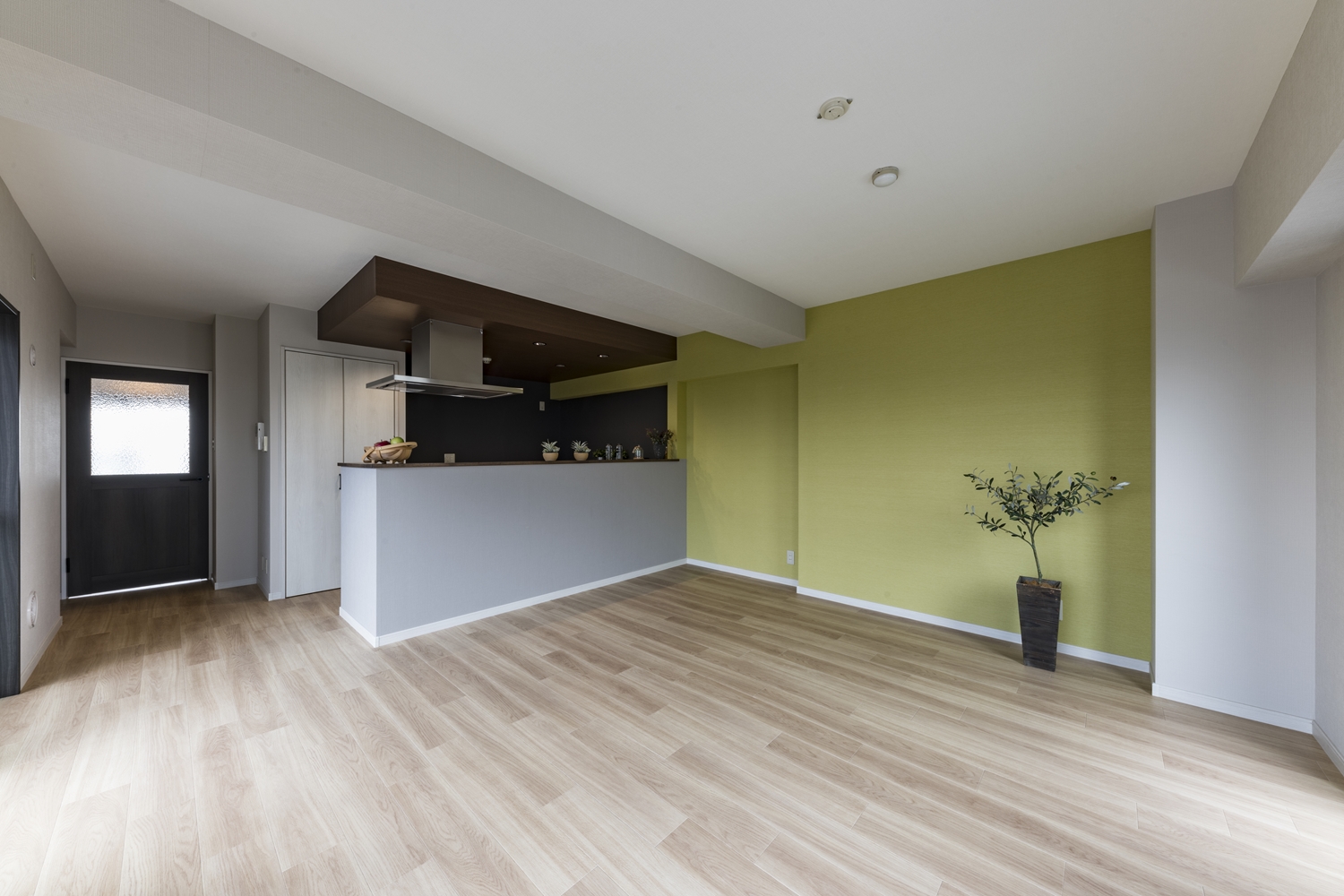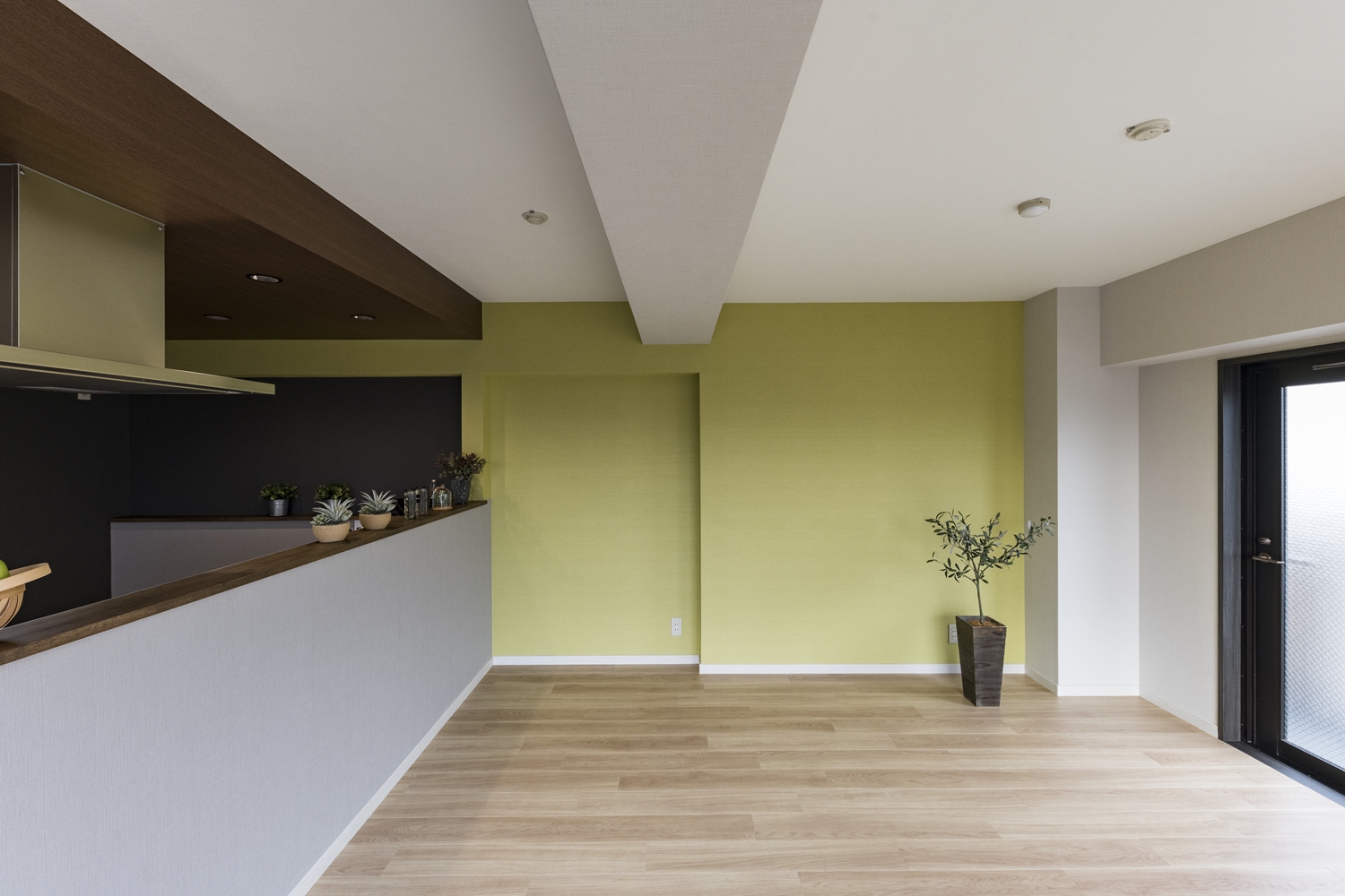 リビング/ナチュラルな木目のフロアに爽やかなピスタチオグリーンのクロスが空間を彩ります。キッチン周りにシックなトーンのクロスをあしらって空間をひきしめました。