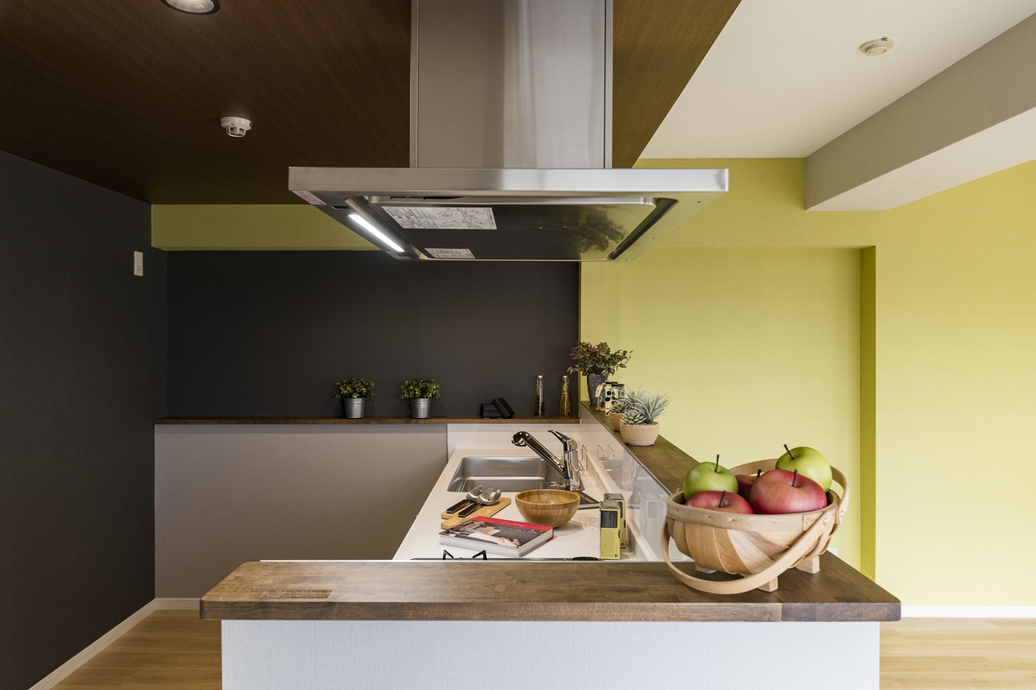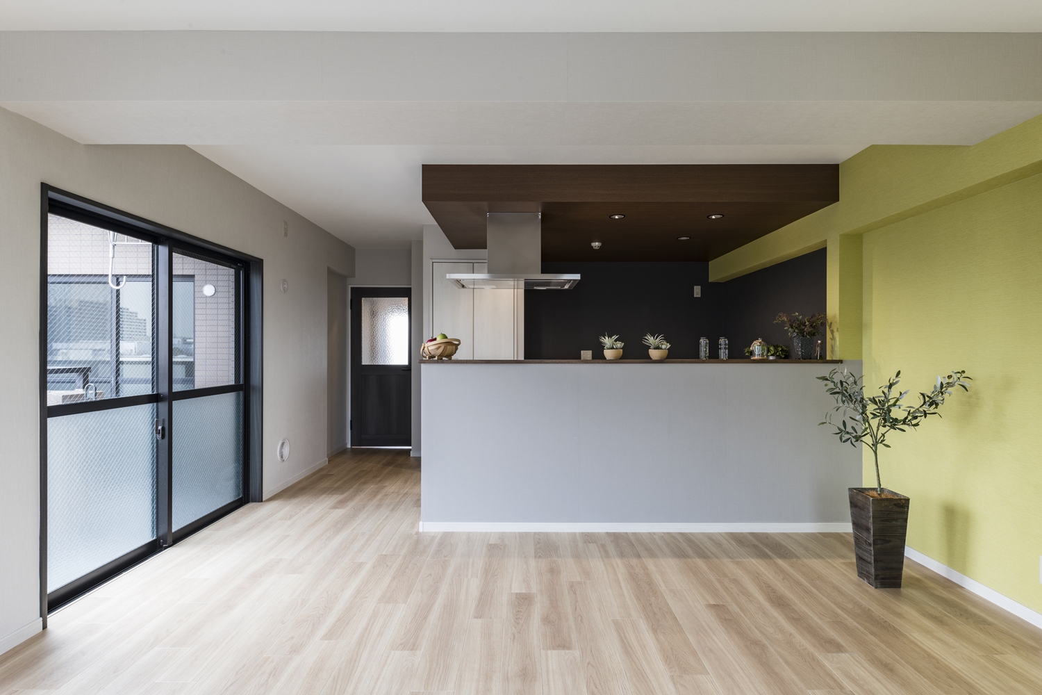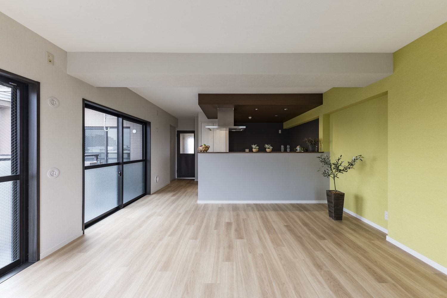 リビング/ナチュラルな木目のフロアに爽やかなピスタチオグリーンのクロスが空間を彩ります。キッチン周りにシックなトーンのクロスをあしらって空間をひきしめました。