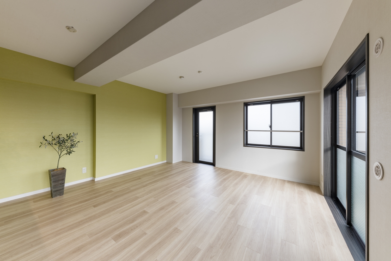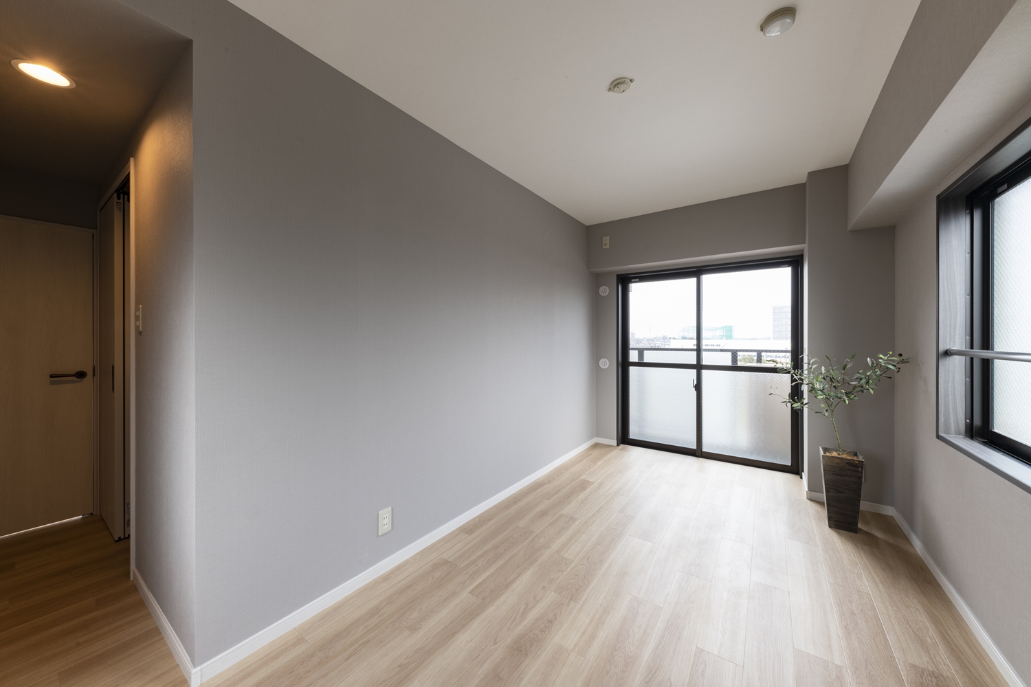 洋室/天井・壁のクロスの貼り替え、床材の上張りを行いました。淡いグレーのクロスをアクセントにした、やわらかさとシックさを合わせ持った落ち着いた空間に仕上がりました。