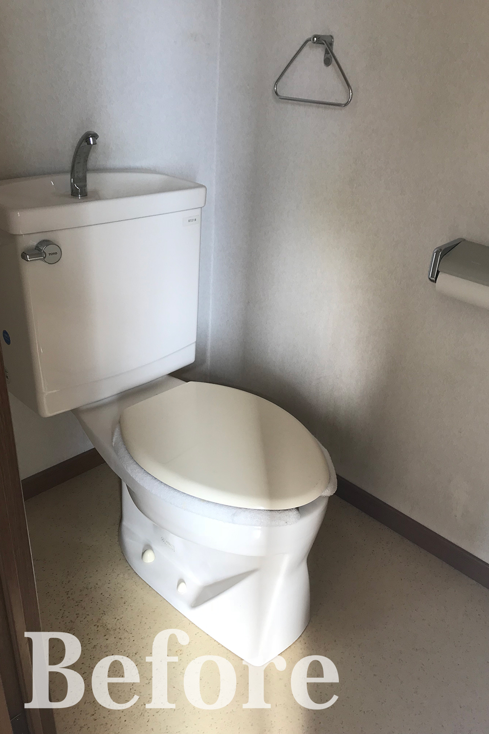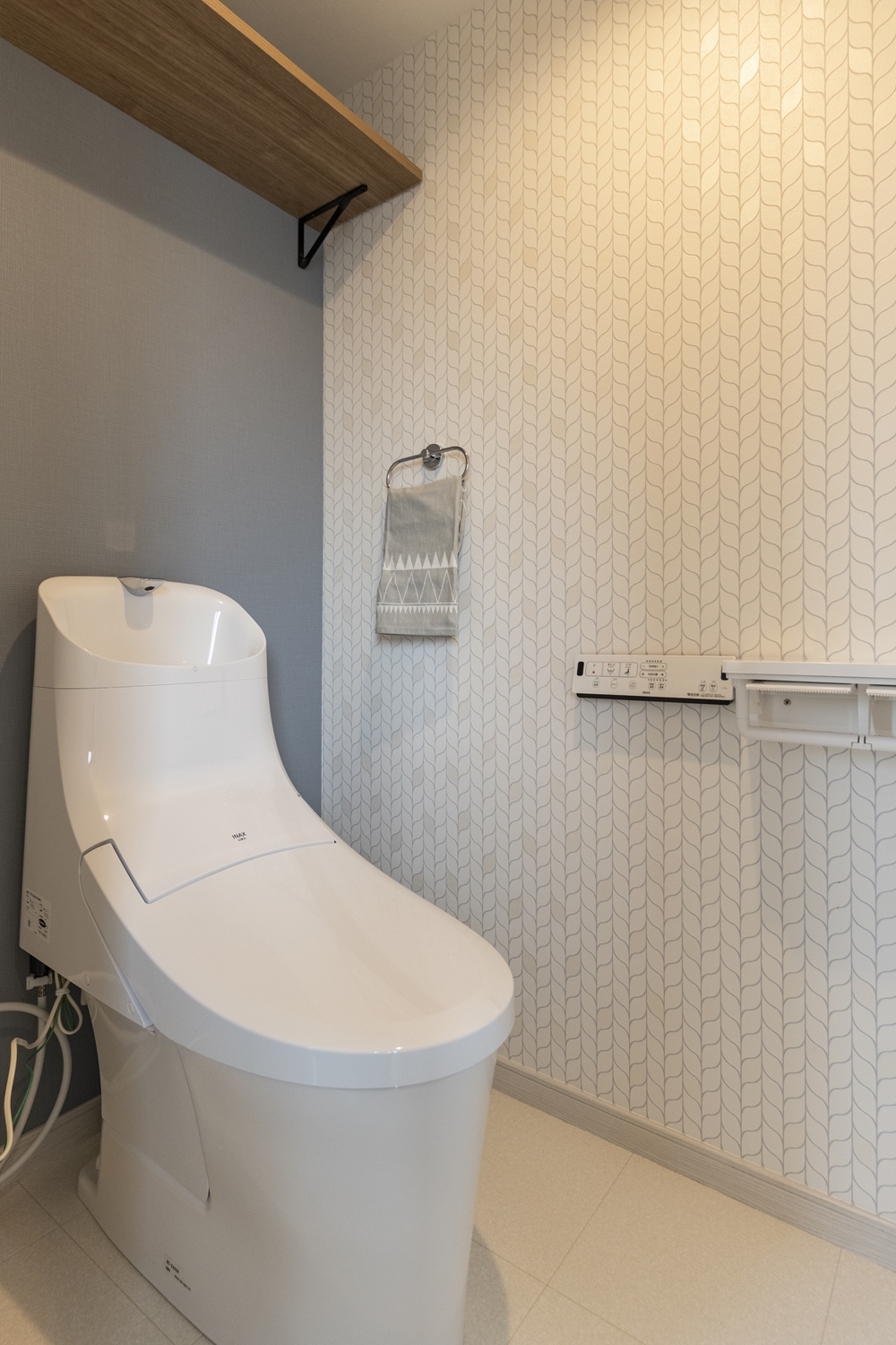 トイレ/床・クロスの全面張替え、便器・照明器具の交換を行いました。角度によってキラリと光ってみえる北欧デザインの白い壁紙と、ブルーグレーの壁紙を組合せ、大人っぽさと可愛さを合わせ持った素敵な空間に♪