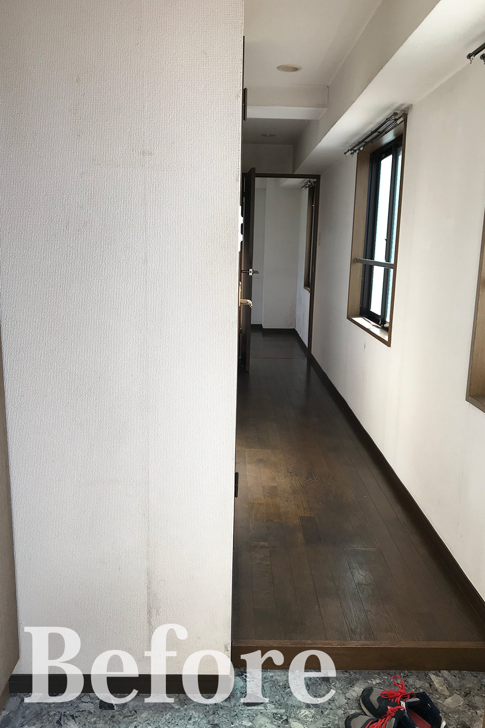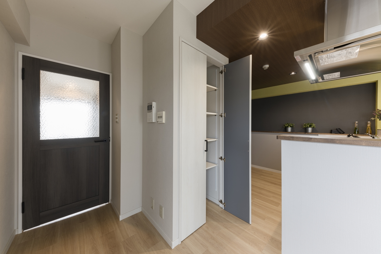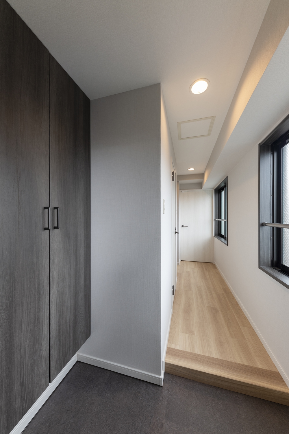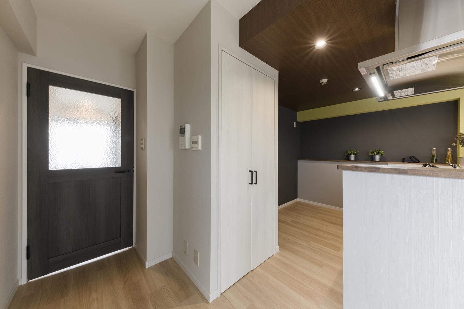 玄関/天井・壁紙、床材を貼り替えました。グレイッシュなカラーのシューズBOXや床材を施し、大人っぽくクール過ぎない柔らかな印象に仕上がりました。