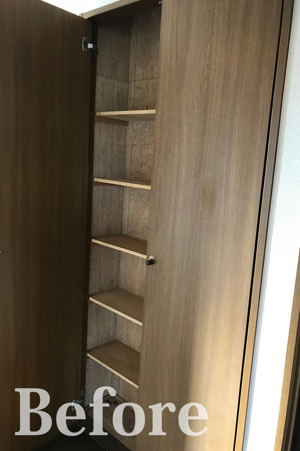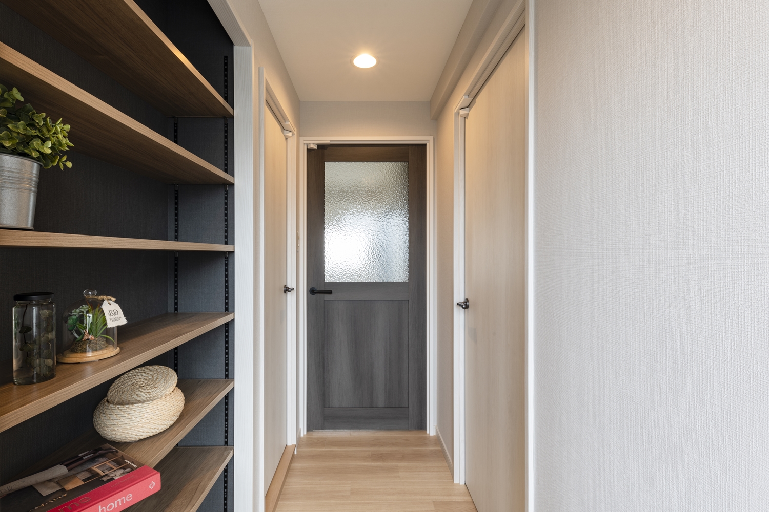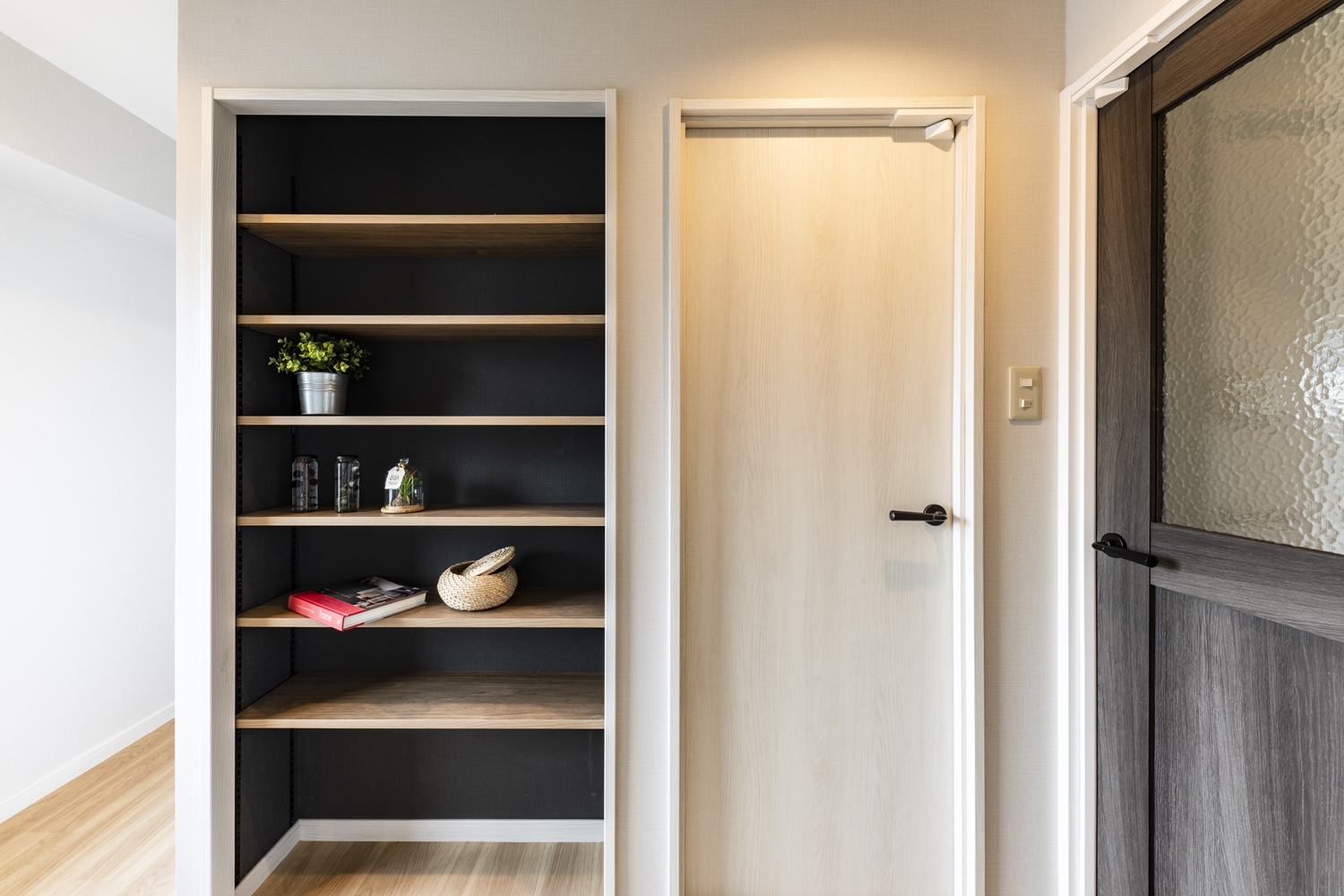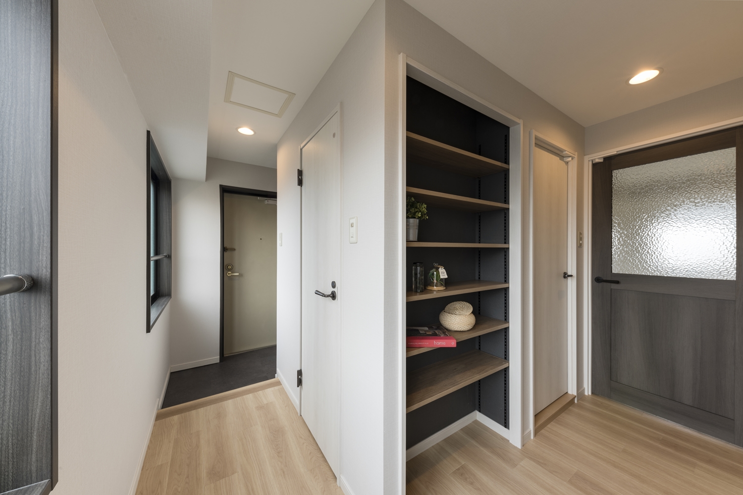 廊下収納/扉を撤去し「飾る・使う・しまう」を楽しむ魅せるオープン棚に大変身しました!濃い色のクロスを使ってコントラストをつける事で、空間がひきしまりグッとおしゃれな空間になりました♪