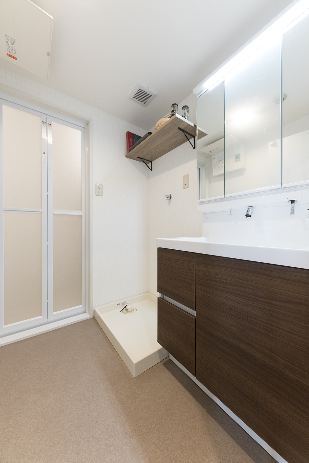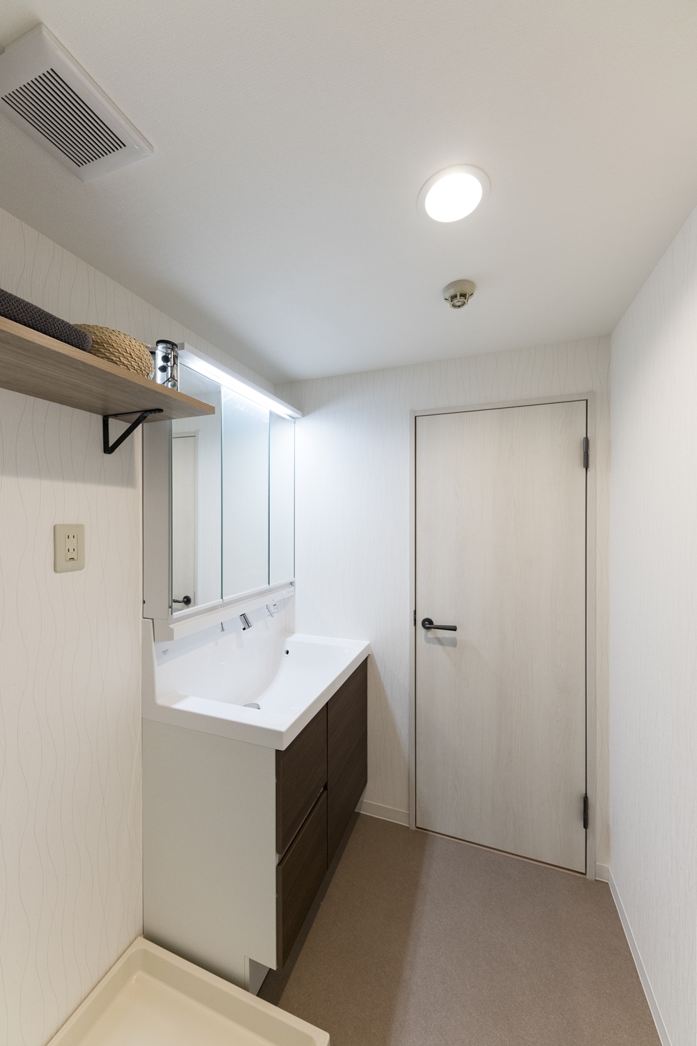 洗面室/洗面化粧台・照明の交換、クロス、床材の貼り替えを行いました。白を基調とした清潔感のある空間になりました。