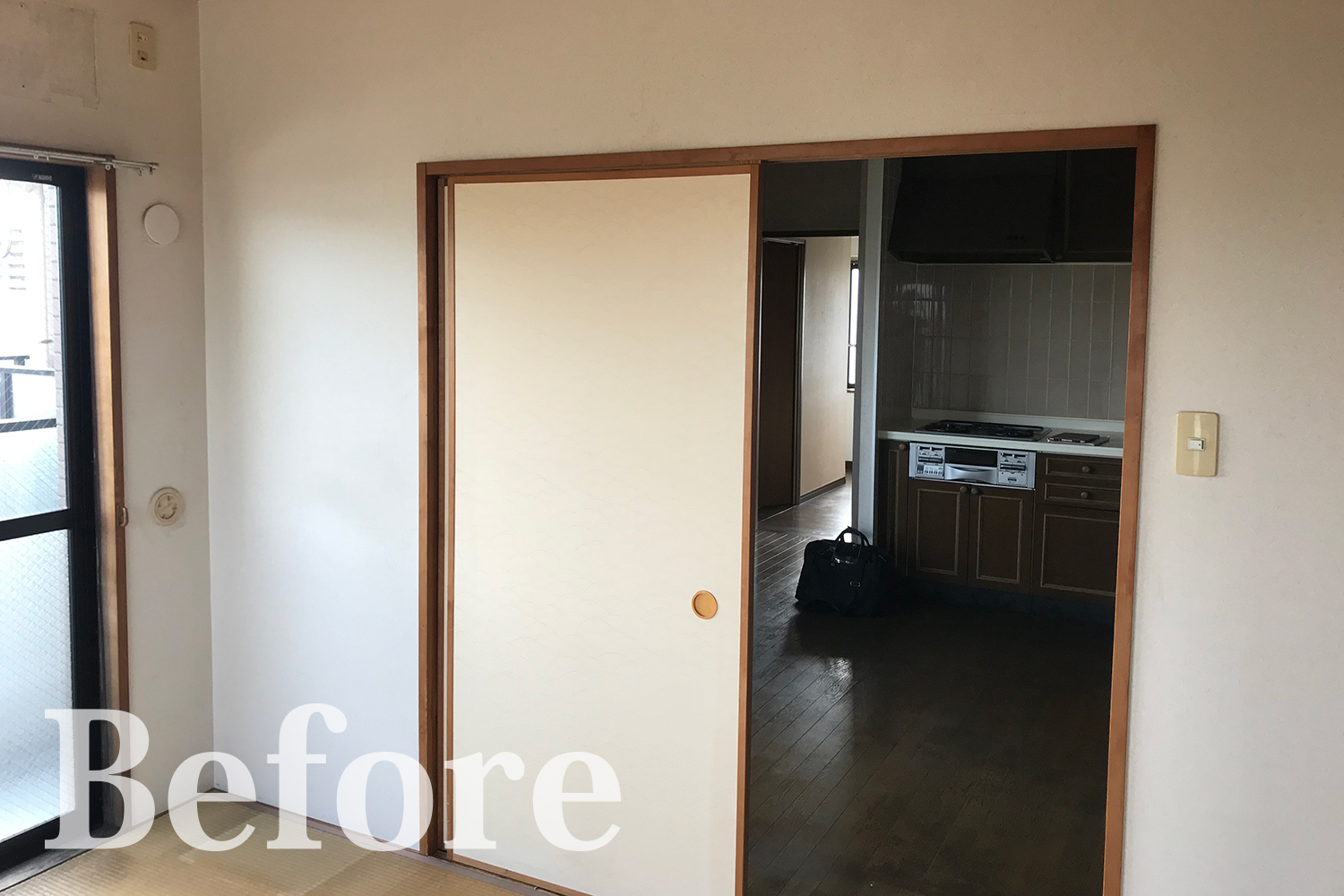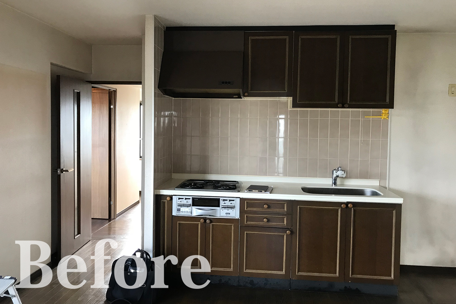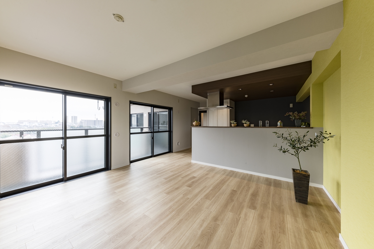全室、天井・壁のクロスの貼り替えや床材の上張り、照明や建具・設備の交換を行いました。キッチンのレイアウトを対面に変えて、ビューキッチンが主役の開放的なリビングに生まれ変わりました!