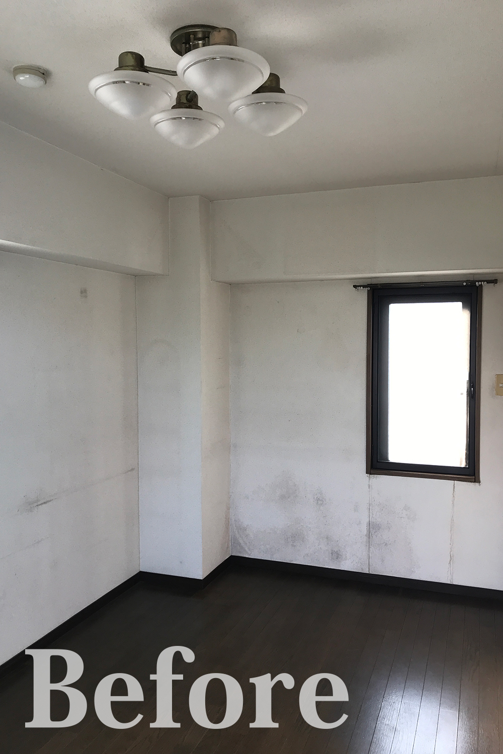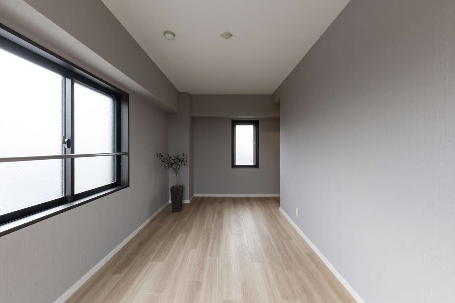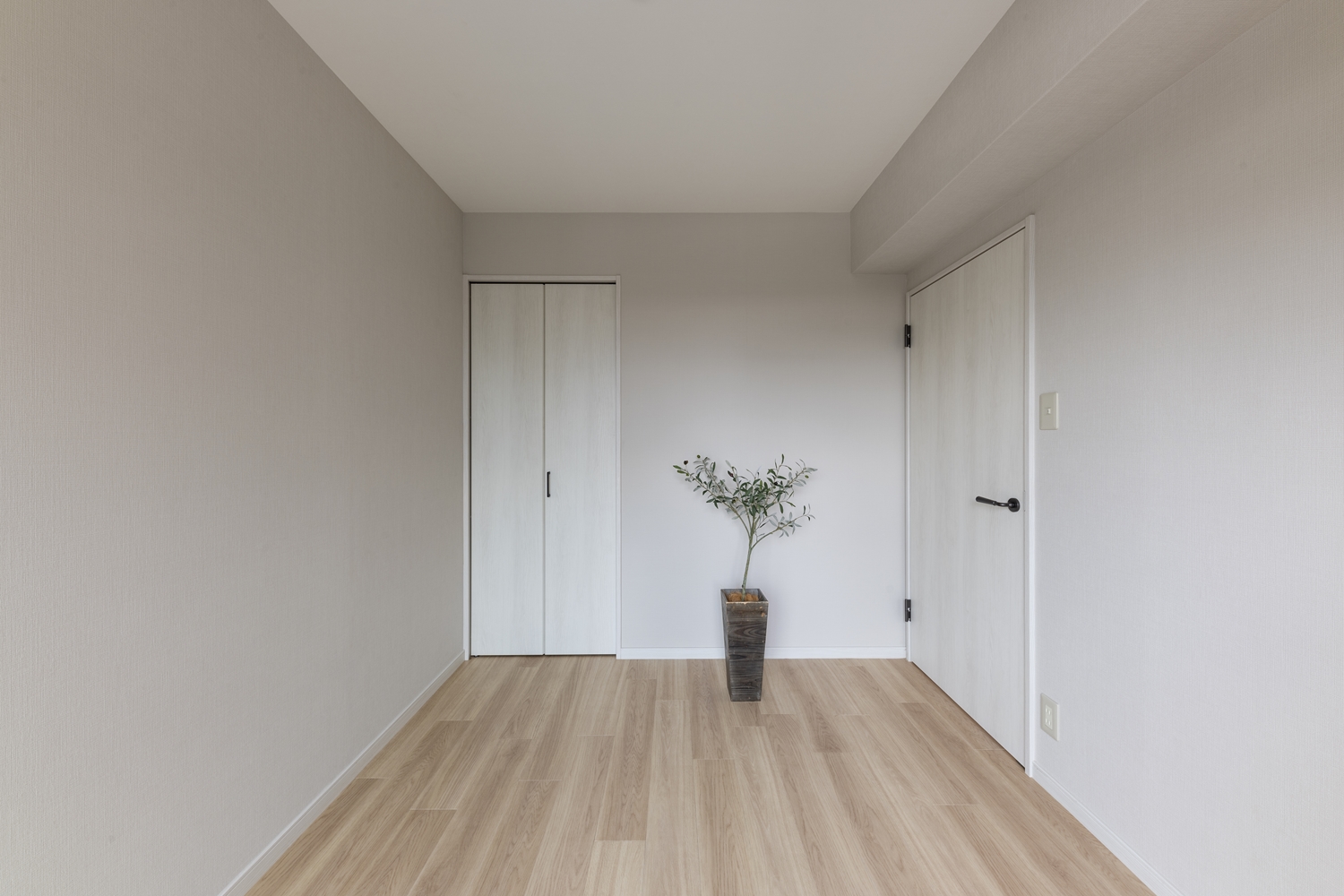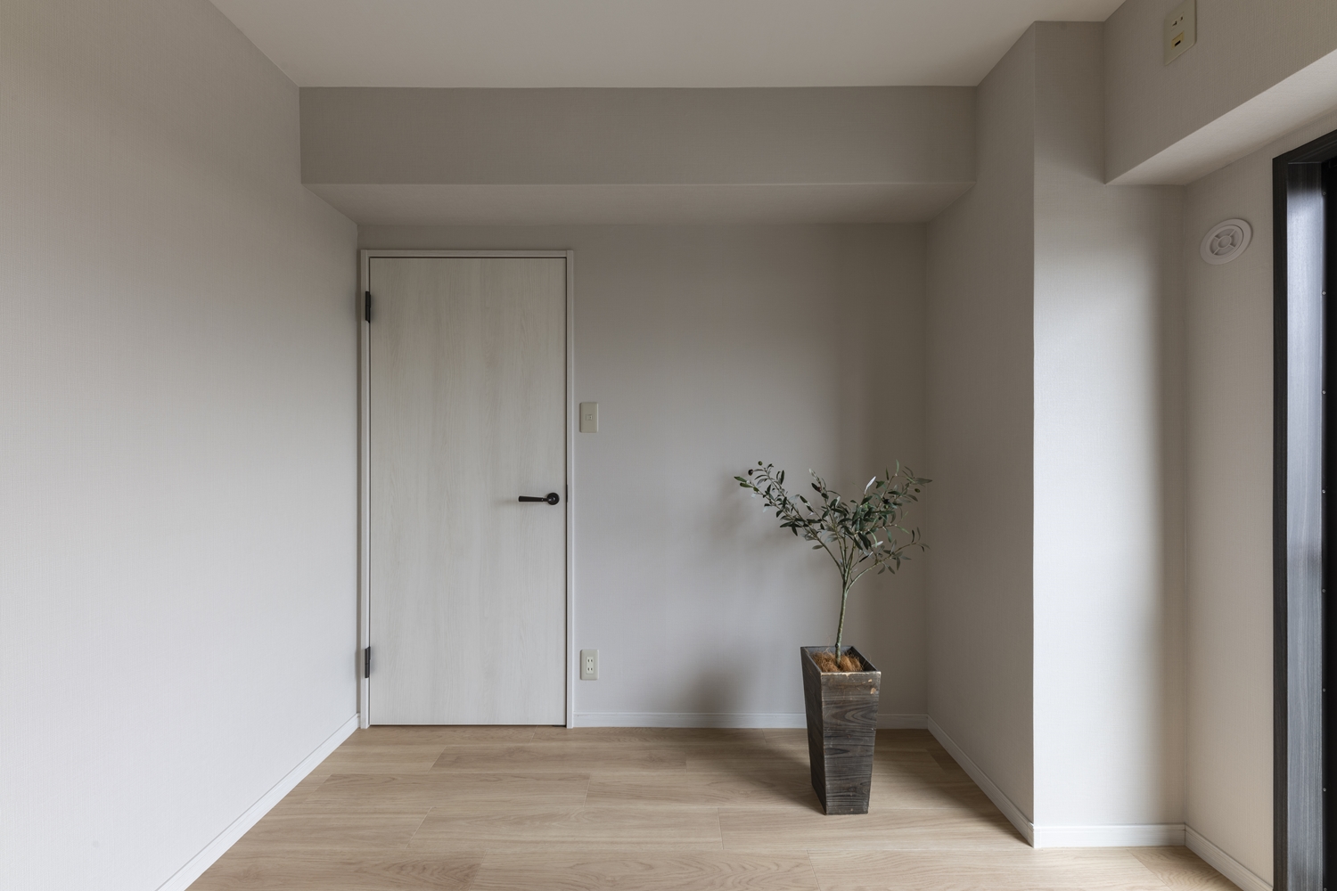 洋室/天井・壁のクロスの貼り替え、床材の上張りを行いました。「キレイめなビンテージシック」をイメージして、ナチュラルな木目の床に薄いグレーのクロスを合わせました。