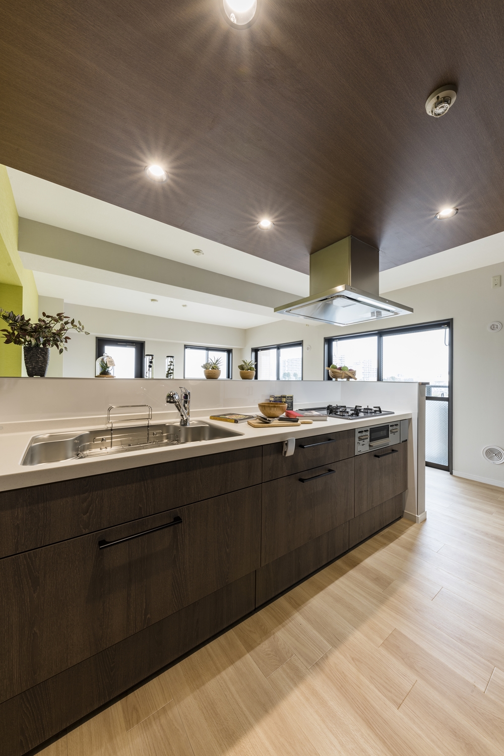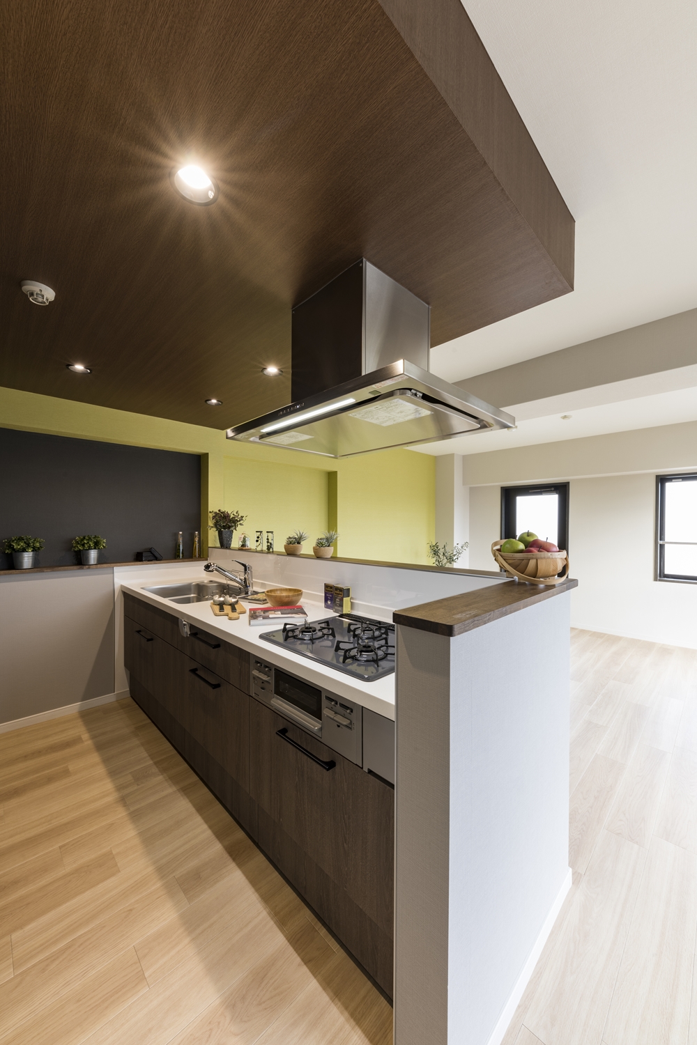 キッチンを対面にする為に、上部の天井を下げて、電気設備関係を通しました。ダークトーンの木目調のクロスやダウンライトを施すことで、グッとおしゃれな空間に仕上がりました♪