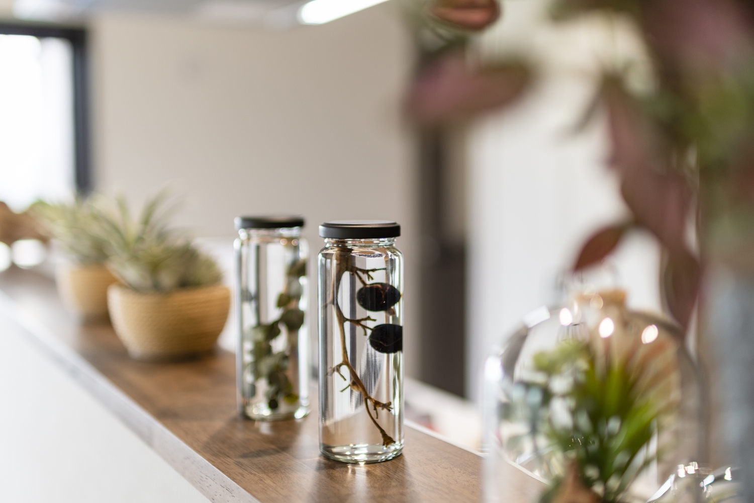 手元を目隠ししつつ、配膳やアイテムを飾ったりインテリアも楽しむ、キッチンカウンターを施しました。
