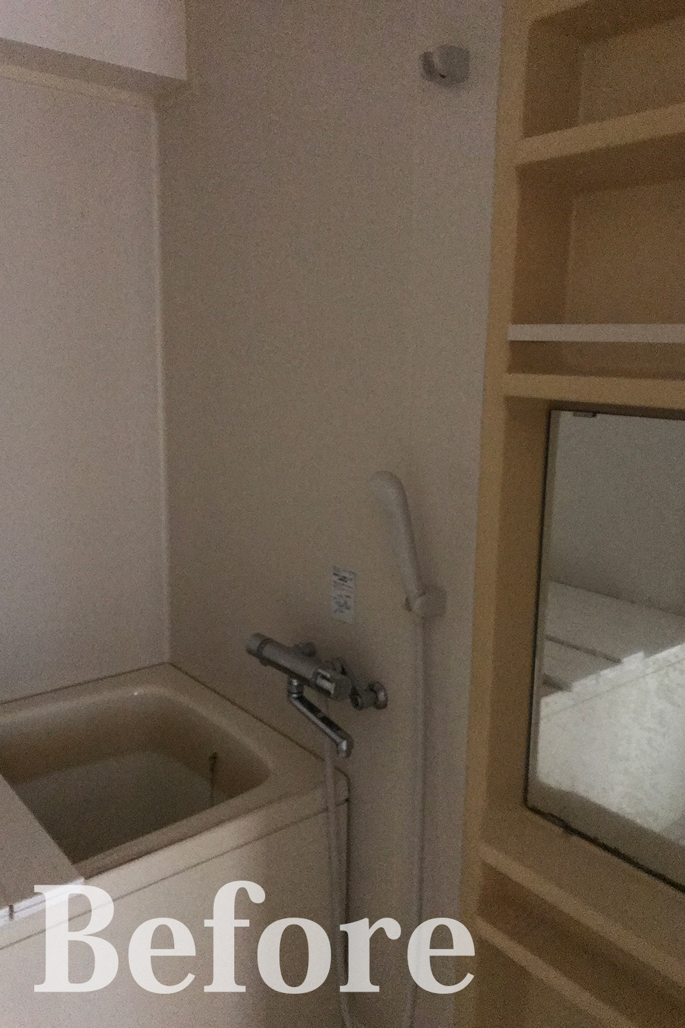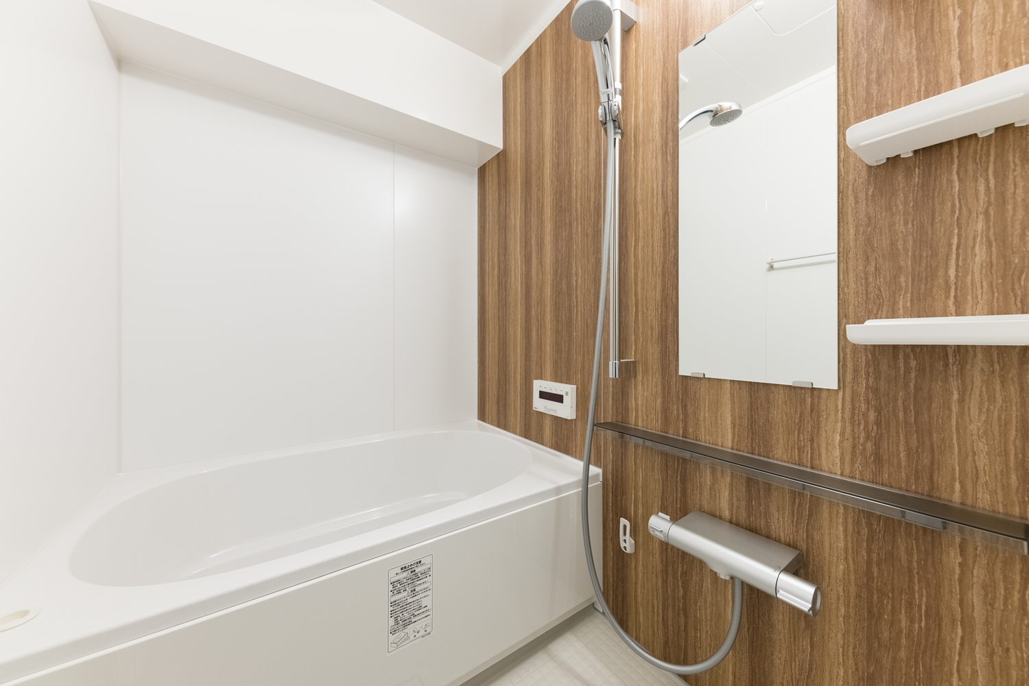 バスルーム/全面改修工事を行いました。木目の自然な風合いのアクセントパネルが空間に温もりをあたえます。