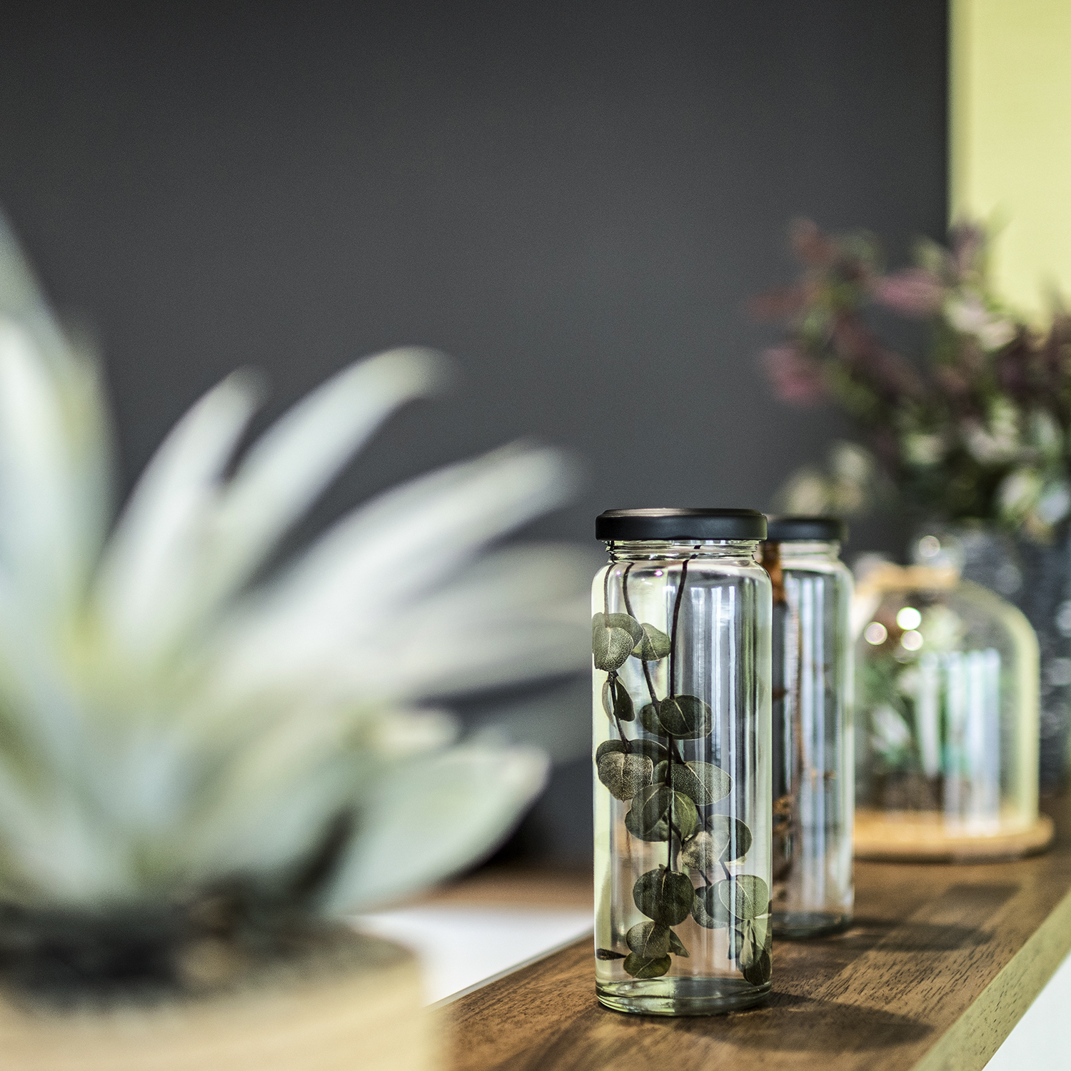 壁側の配管スペースを利用したカウンターは、小物やパスタを飾ったり、スパイス棚として使うのにとっても便利な場所に♪シックなトーンのクロスをあしらって空間をひきしめました。