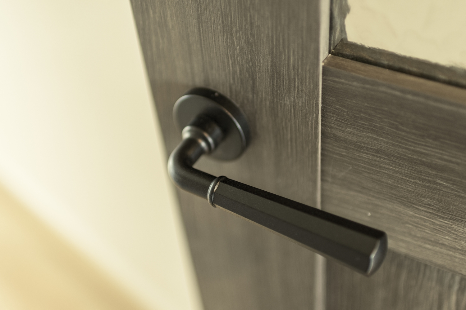 アンティーク家具などによく使われている型板ガラスをあしらった、おしゃれなスモークグレーのリビングドアに交換しました。