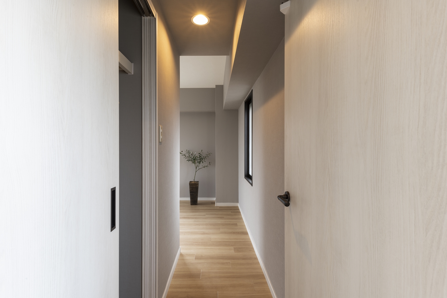 玄関・廊下/グレイッシュなカラーのシューズBOXや床材を施し、大人っぽくクール過ぎない柔らかな印象に仕上がりました。