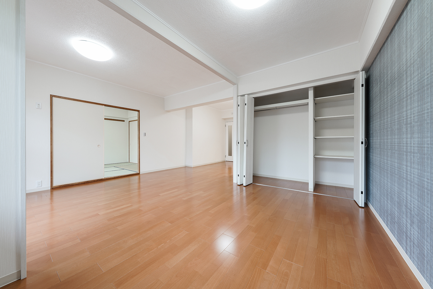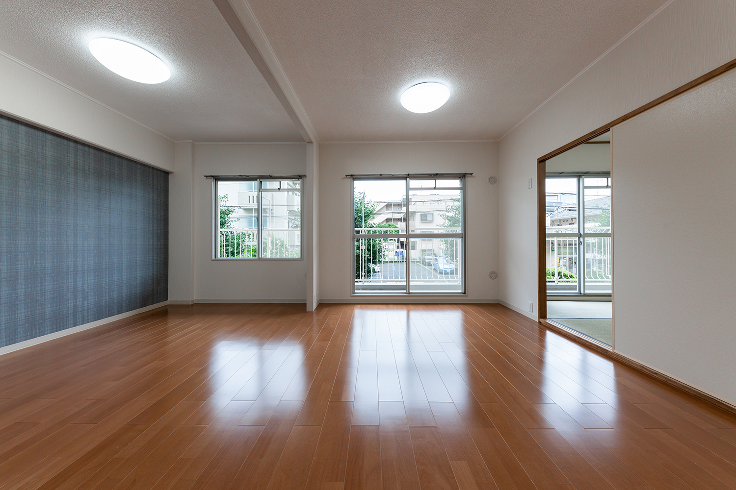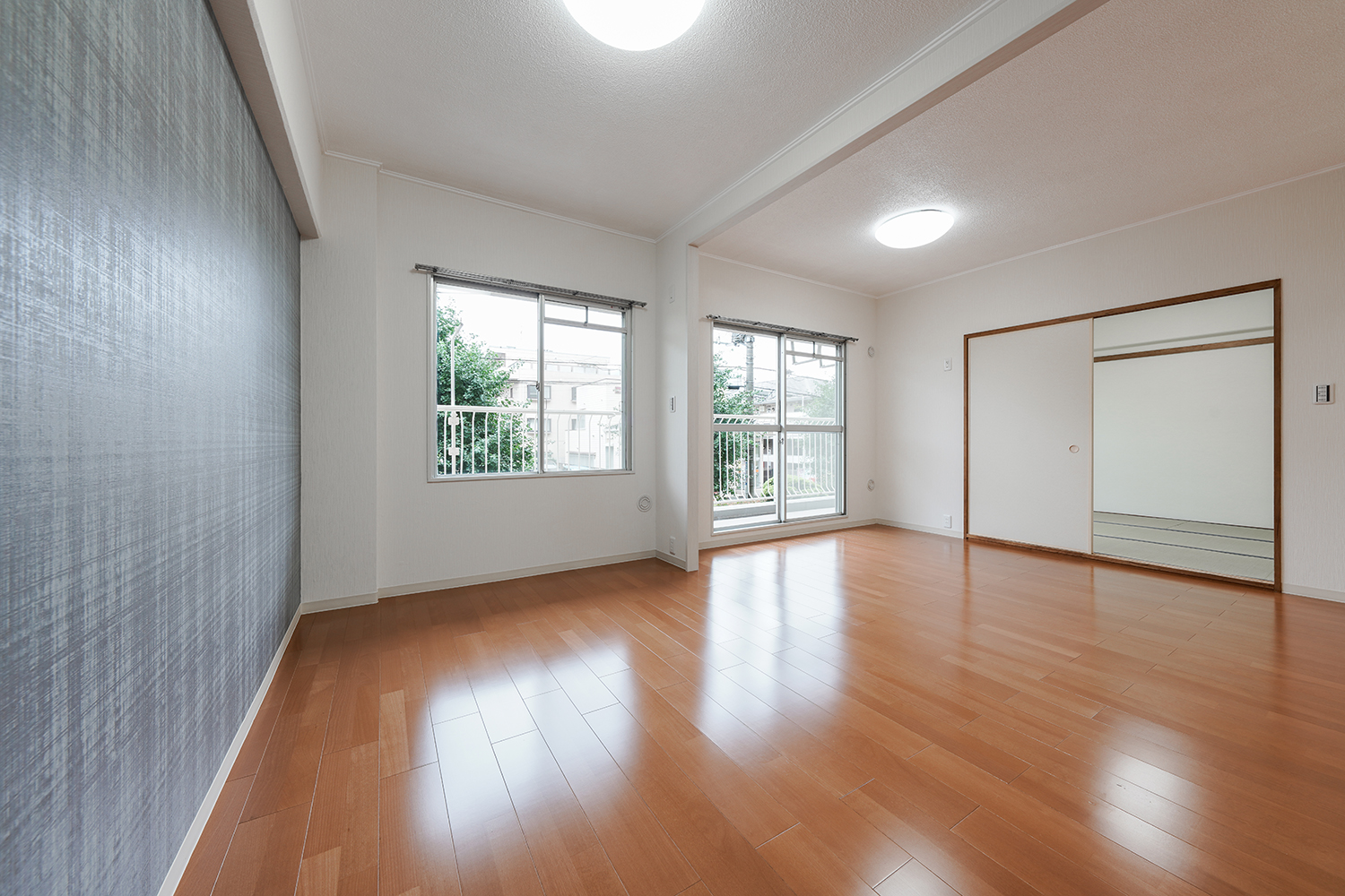 マンション一室のリフォーム工事のご紹介です。お部屋全室、天井・壁のクロスの貼り替え、床材の上張り、照明や建具の交換を行いました。ナチュラルな色の木目が印象的で温かな空間になりました。
