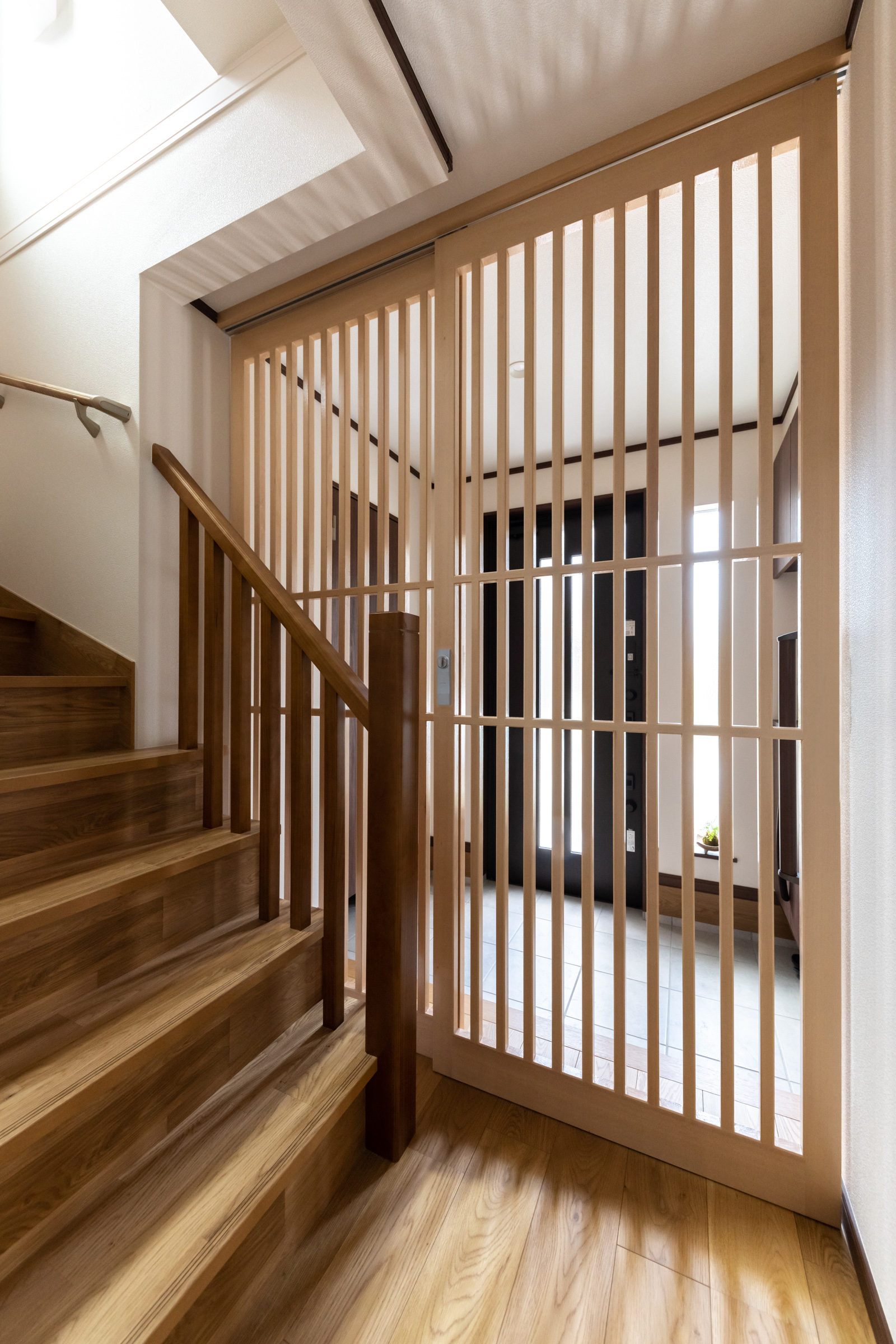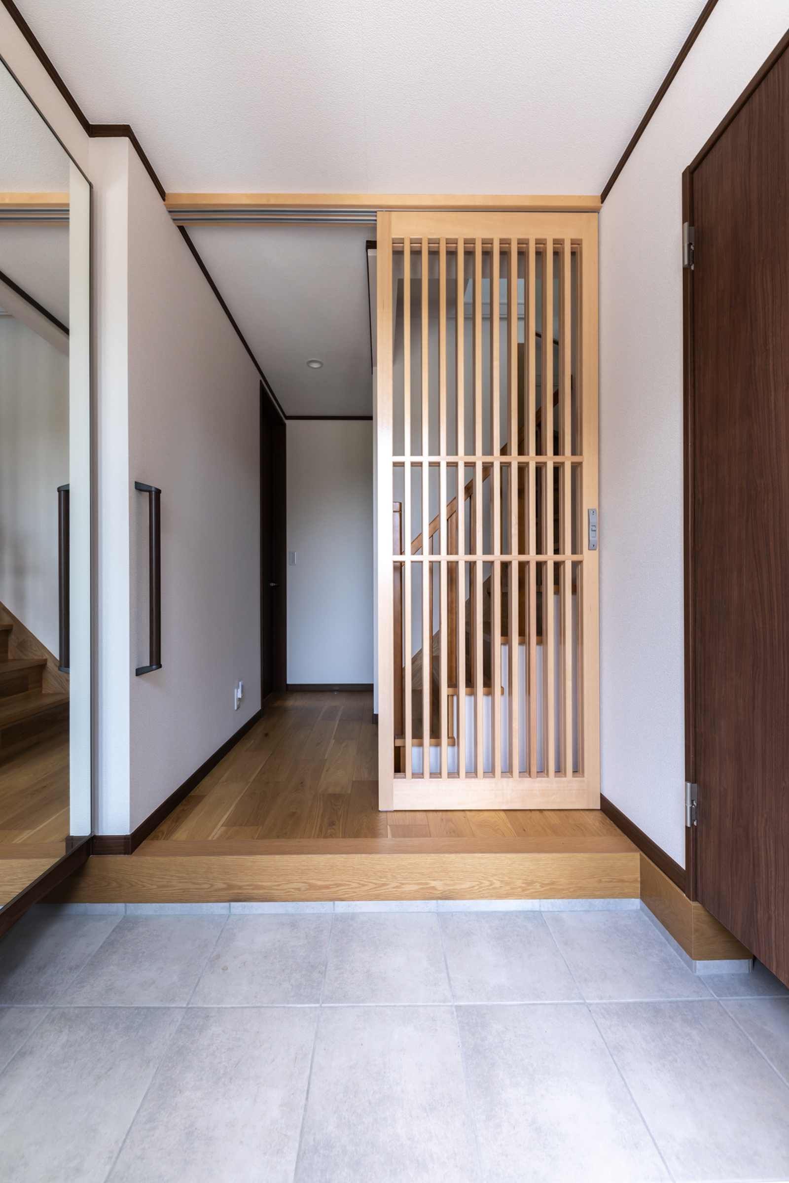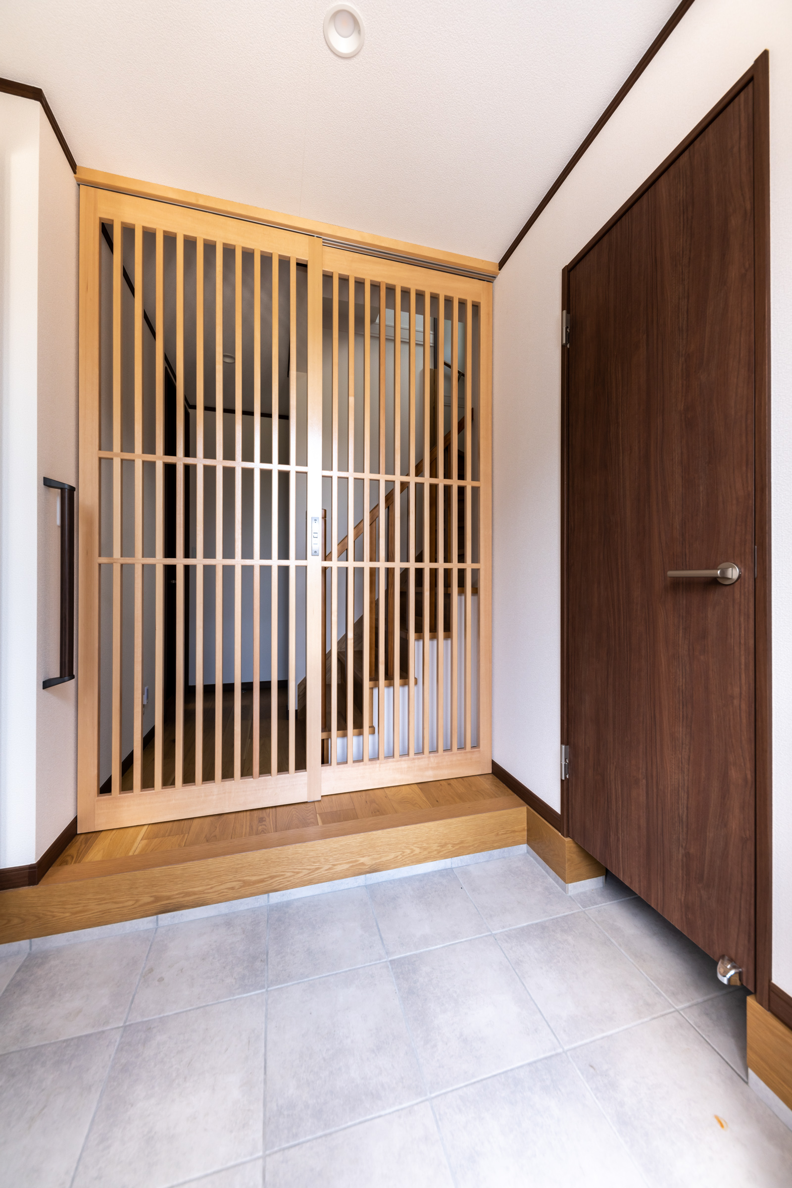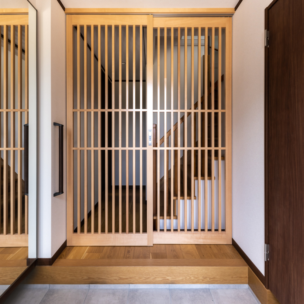 大切なペットが不意に外へ飛び出して逃げてしまう事考えて 玄関にフルオーダーのスライド格子ドアを設置しました。
